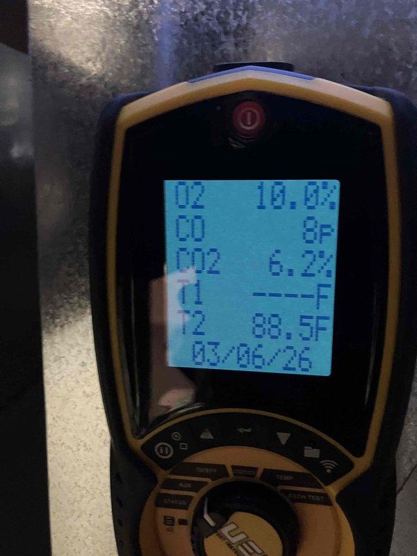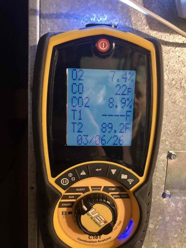 Performed annual inspection on 4+ year old furnace. Inspected blower wheel assembly for proper operation and conducted combustion analysis with readings of O2 10.9%, CO 31ppm, CO2 5.7%, and stack temperature 86.3°F, all within acceptable parameters.