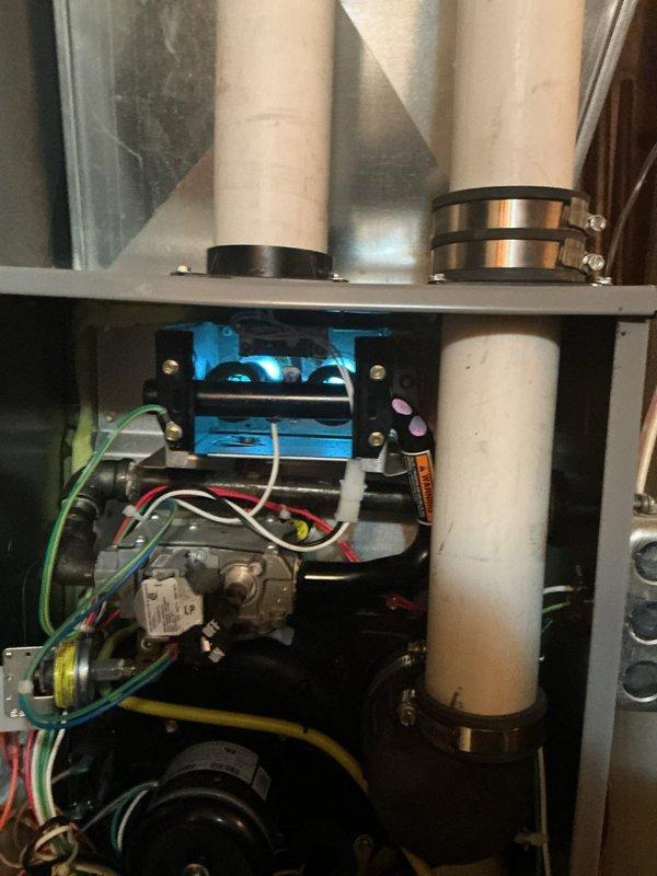 Completed replacement of degraded burners, flame sensor and ignitor on customer's heating system as per approved estimate. Verified proper flame pattern and ignition sequence after installation, with unit now demonstrating normal blue flame combustion and appropriate operation.