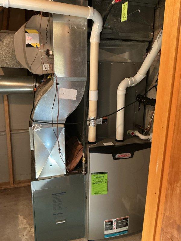 Performed annual preventative maintenance on a 2-year-old Lennox furnace system. Inspected all components including gas connections, PVC intake/exhaust venting, electrical connections, and heat exchanger. System is properly installed with appropriate clearances in basement location and is operating within manufacturer specifications. No issues identified during service.