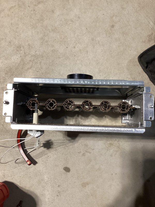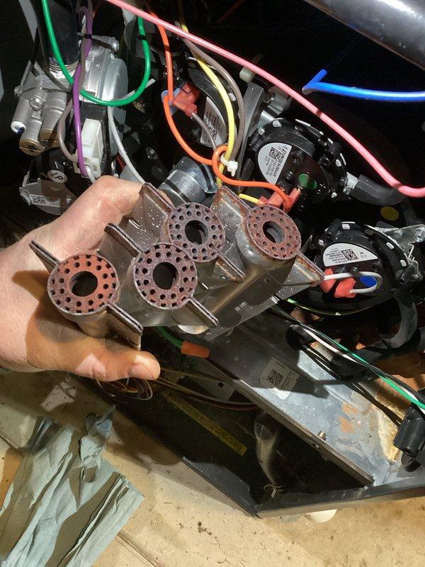 Diagnosed no heat issue in unit under 10 years old. Inspection revealed severely plugged burners with significant rust and debris accumulation in the heat exchanger manifold. Removed burner assembly, thoroughly cleaned ports and passages to restore proper gas flow, reinstalled components, and verified normal ignition sequence and heating operation.