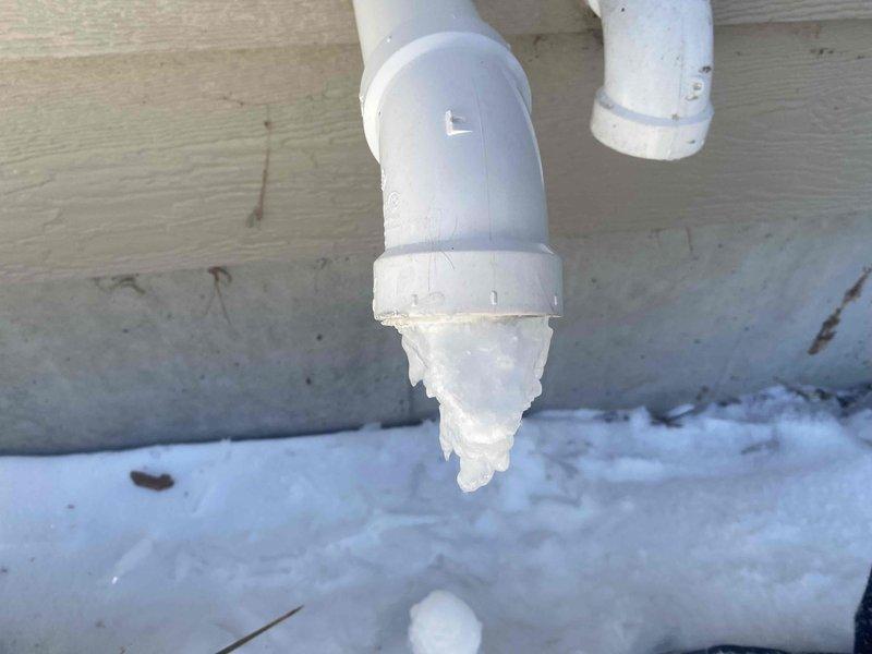 Responded to no-heat emergency call for a 3-4 month old furnace system. Diagnosed issue as frozen condensate exhaust line, evident by significant ice formation at the PVC pipe outlet. Replaced the damaged frozen fitting to restore proper exhaust flow and system operation.