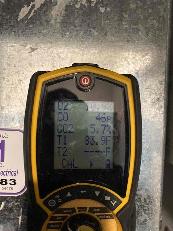 Responded to no-heat call for a 10+ year old system. Diagnostic testing revealed a plugged intake pipe on the roof which could not be cleared. Combustion analysis performed with digital analyzer showing O2 at 20.9%, CO at 46F, and CO2 at 5.7%, confirming ventilation issues that prevented proper system operation.
